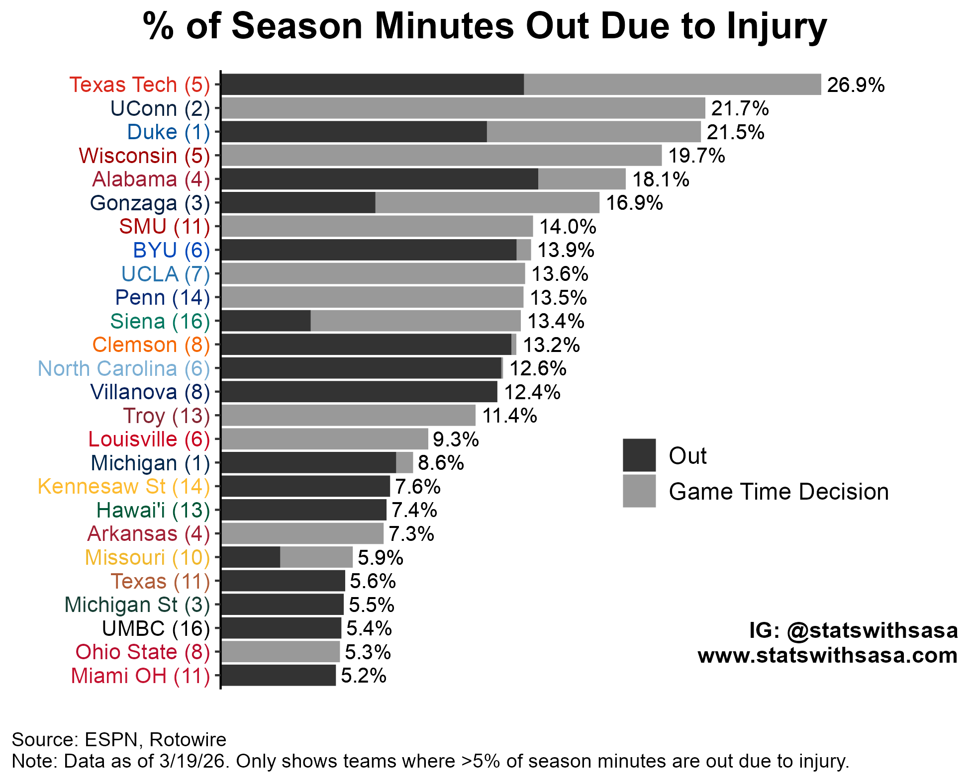 It looks like Texas Tech (5), UConn (2), and Duke (1) are particularly affected by injuries going into the tournament. Interestingly, Texas Tech and Duke were both in the top 3 most injured teams last year as well.
