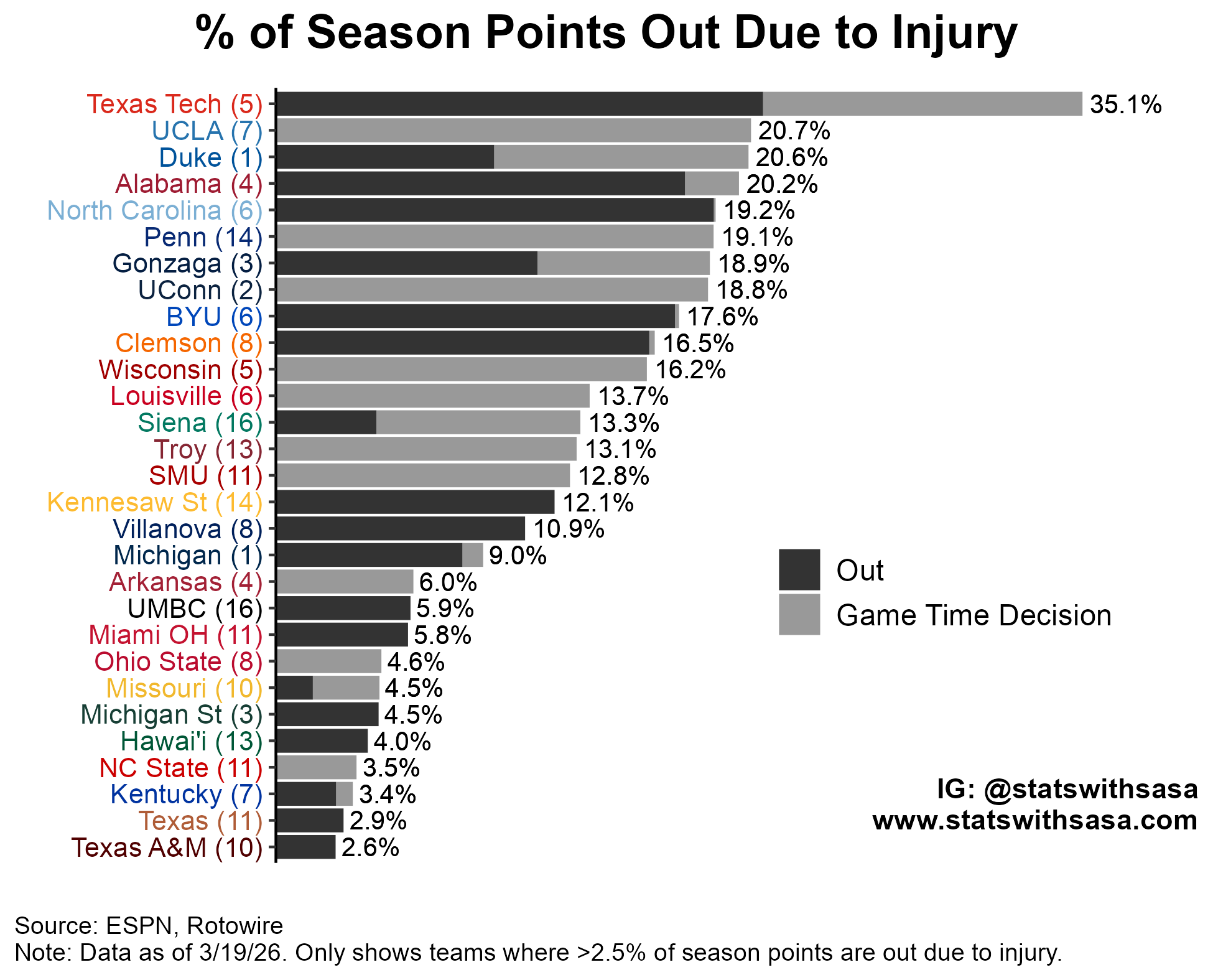 It looks like UNC (6) and Penn (14) in particular have injuries to high scoring players, even if those players accounted for comparatively fewer season minutes. Texas Tech again stands out at the top of the chart.