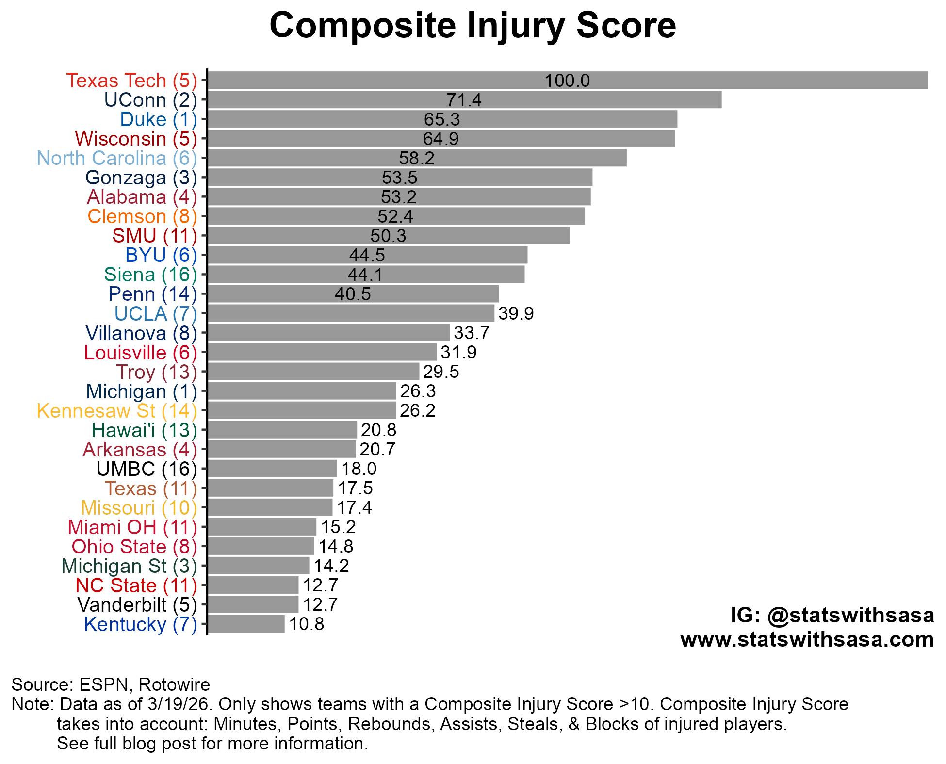 According to my Composite Injury Score, Texas Tech (5), UConn (2), Wisconsin (5), and Duke (1) are most heavily impacted by injuries going into the tournament.
